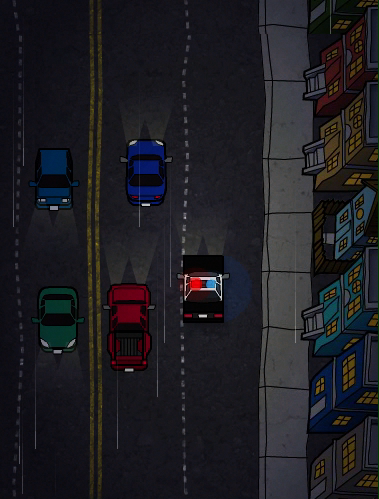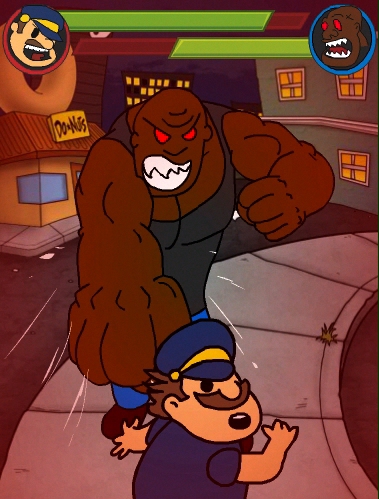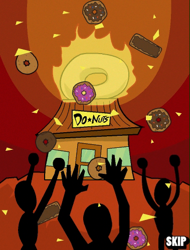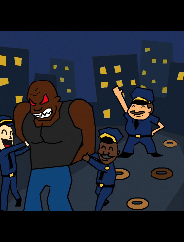 Everyone knows police officers fantasize about the burning of Donut Shops, and Officer Brown is no exception. With donuts bursting in air, there's proof in the night that Officer Brown will be there. You assume duty as our rotund hero crosses the thin blue line with sweet dreams of round treats bouncing behind his eyes--plenty o' donuts to get.