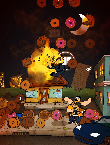 The web-based Flash version is 3 games in 1: driving, fighting and donut getting. The player's actions change the game itself and multiple cinematic endings are available.